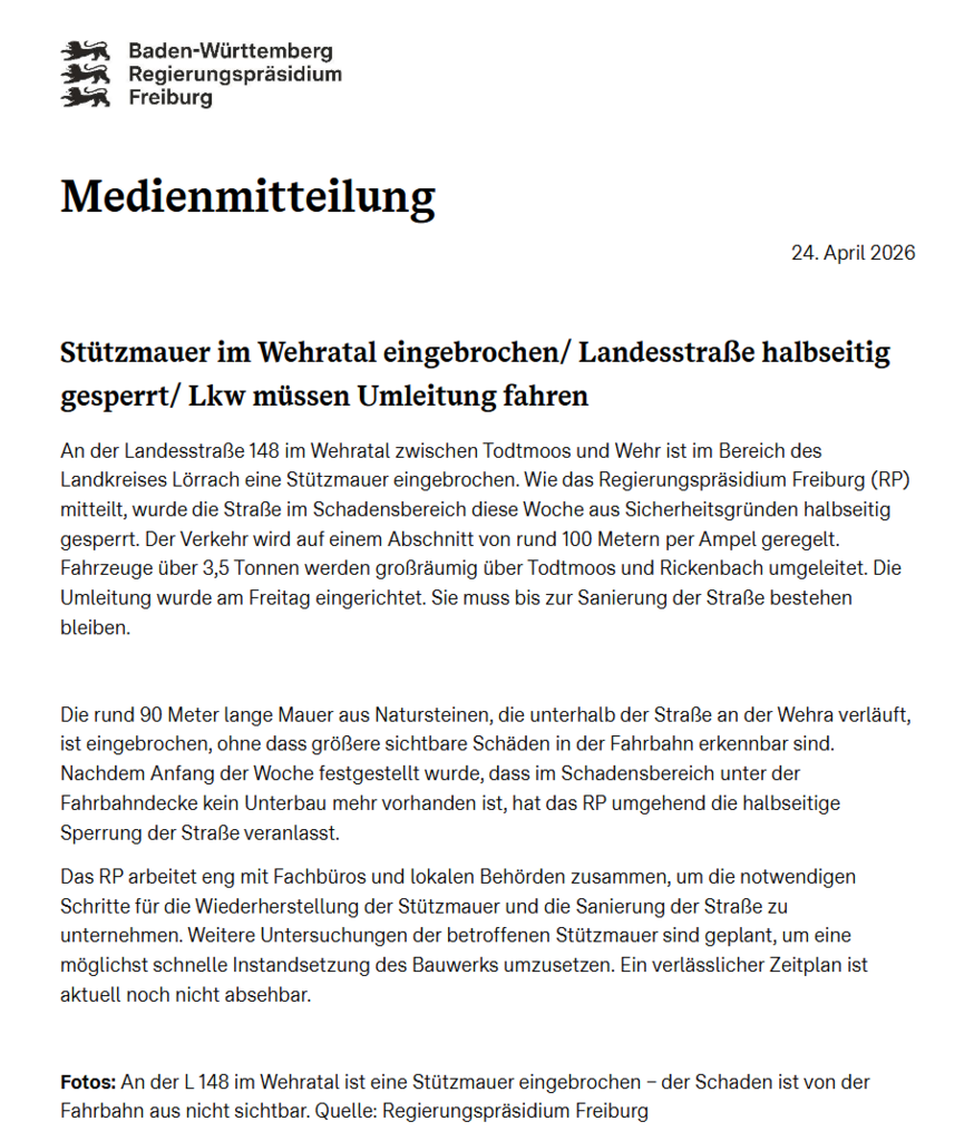 An der Landesstraße 148 im Wehratal zwischen Todtmoos und Wehr ist im Bereich des Landkreises Lörrach eine Stützmauer eingebrochen. Wie das Regierungspräsidium Freiburg (RP) mitteilt, wurde die Straße im Schadensbereich diese Woche aus Sicherheitsgründen halbseitig gesperrt. Der Verkehr wird auf einem Abschnitt von rund 100 Metern per Ampel geregelt. Fahrzeuge über 3,5 Tonnen werden großräumig über Todtmoos und Rickenbach umgeleitet. Die Umleitung wurde am Freitag eingerichtet. Sie muss bis zur Sanierung der Straße bestehen bleiben.Die rund 90 Meter lange Mauer aus Natursteinen, die unterhalb der Straße an der Wehra verläuft, ist eingebrochen, ohne dass größere sichtbare Schäden in der Fahrbahn erkennbar sind. Nachdem Anfang der Woche festgestellt wurde, dass im Schadensbereich unter der Fahrbahndecke kein Unterbau mehr vorhanden ist, hat das RP umgehend die halbseitige Sperrung der Straße veranlasst.
