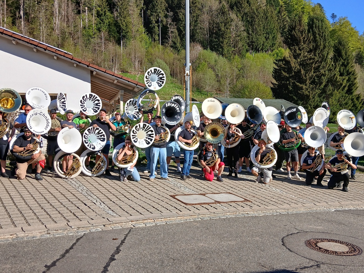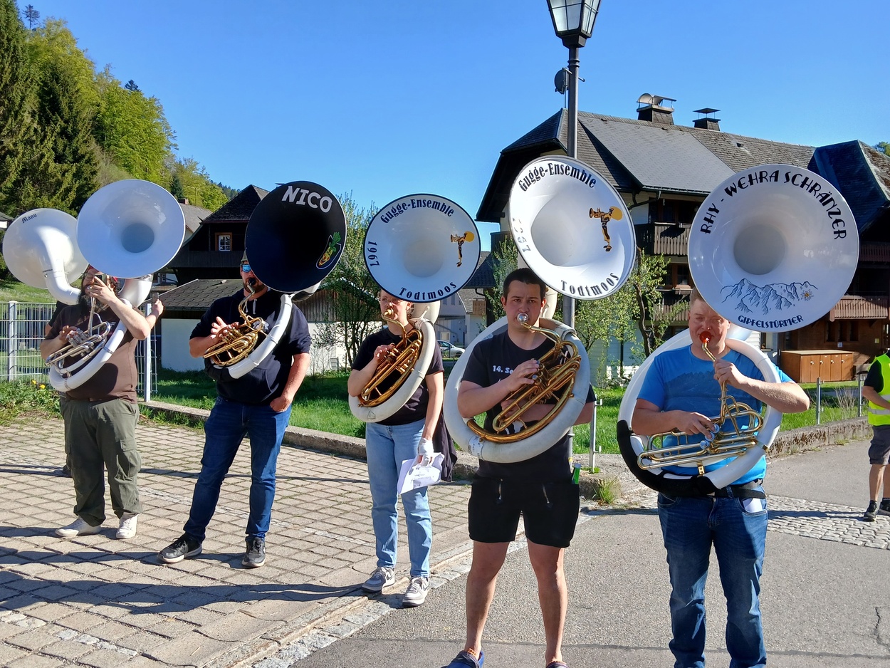 Der erste Todtmooser Sousa Lauf begeisterte die Zuschauer und Teilnehmer gleichermaßen. Bei strahlendem Sonnenschein zogen rund 50 Sousa Spieler mit ihren mächtigen Instrumenten durch das Lebküchlerdorf. Gestartet wurde um 16.00 Uhr an den Wasserfällen in Hintertodtmoos. Durch den Ortsteil Höfle ging weiter bis in die Hauptstraße und den Häusleweg hinaus auf den Sportplatz. Unterwegs konnten sich die Teilnehmer (unter anderem aus dem Markgräfler Land, aus der Ortenau, aus Küssaberg, aus Wehr, Buch und Brenden sowie vom Hotzenwald) an verschiedenen Getränkestationen stärken. Der Sousa Lauf wurde von Organisator Samuel Mutter kräftig beworben. So war es nicht verwunderlich, dass Sousa Spieler aus der ganzen Region den Weg nach Todtmoos fanden.