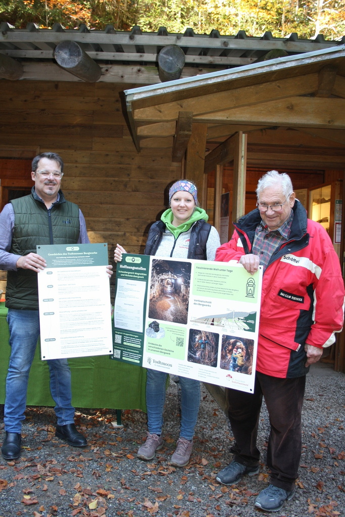 Aus diesem Anlass fand am Bergwerk eine kleine Feierstunde statt, zu der Bürgermeister Marcel Schneider eingeladen hatte. Die Bewirtung mit Kaffee und Kuchen hatte der Schwarzwaldverein Todtmoos übernommen. Marcel Schneider dankte insbesondere Ludwig Müller und Sepp Zimmermann für ihr Engagement für die Betreuung der bei Touristen beliebten Einrichtung: „Es ist gut, dass wir uns auf die Bergbautradition in Todtmoos besinnen“. In seinem Rückblick erwähnte Schneider den Initiator und Gönner Karl Heinz Tartsch, der zusammen mit vielen bekannten Todtmoosern in anstrengender Arbeit das Bergwerk wieder für Besucher zugänglich machte. Auch der damalige Bürgermeister Herbert Kiefer habe große Anstrengungen unternommen, um das Projekt zu verwirklichen, so der Schneider.Katharina Maier, die Leiterin der Touristinformation, stellte den Anwesenden zwei neue Infotafeln vor, welche die Gäste mit dem damaligen Bergbau in Todtmoos vertraut machen und das große Stollensystem veranschaulichen. Sepp Zimmermann lobte die gute Zusammenarbeit mit der Gemeinde und der Touristinformation. Die Besucherzahlen sind nach Angaben Zimmermanns sehr gut. An manchen Wochenenden werden bis zu 100 Gäste gezählt, die sich das Bergwerk anschauen. Auch die Bergwerksführungen für Kinder „Schatzsuche im Laternenschein“ werden gut angenommen. Neu im Programm ist die Veranstaltung „Halloween goes Bergwerk“, welche am 29. Oktober für Kinder von 6 bis 14 Jahre angeboten wird. Um 14.30 Uhr beginnt zunächst eine schaurig schöne Schatzsuche. Ab