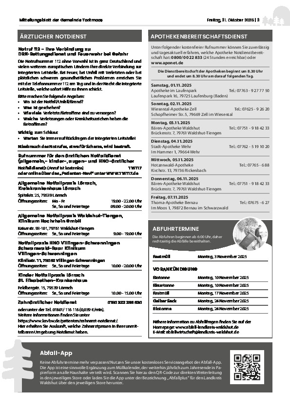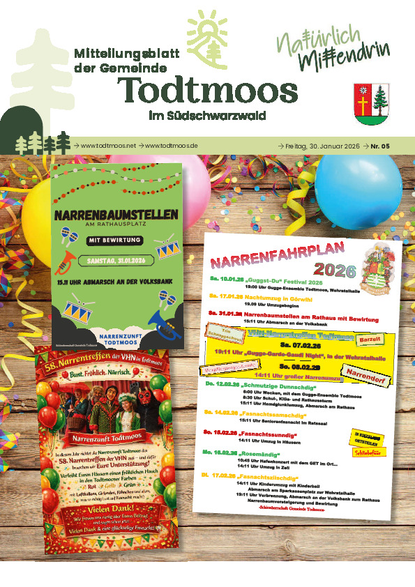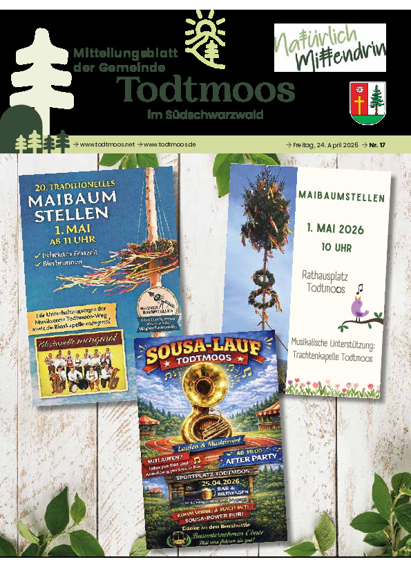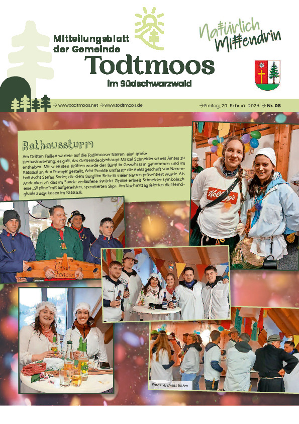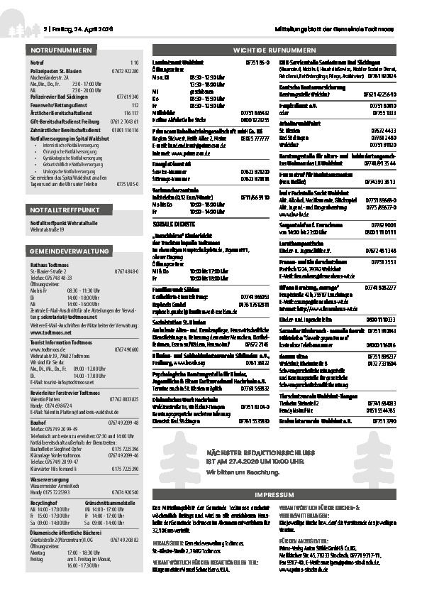 Herausgeber ist die Gemeinde Todtmoos. Für den amtlichen Teil des Mitteilungsblattes ist der Bürgermeister, oder der aktuelle Vertreter im Amt verantwortlich.