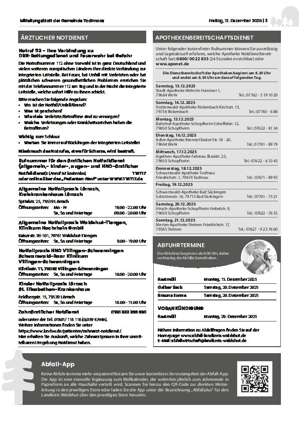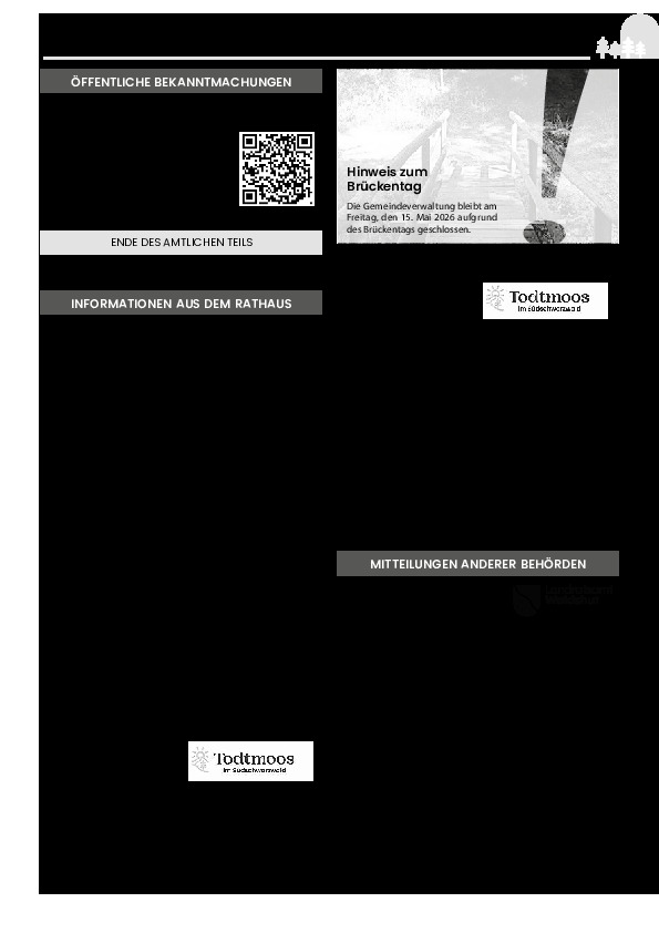Das Mitteilungsblatt der Gemeinde Todtmoos erscheint jeden Freitag.