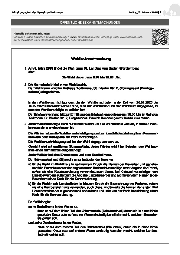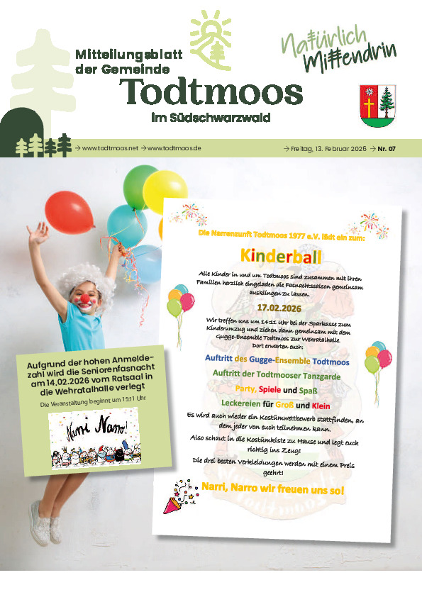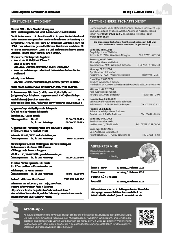 Hier finden Sie alle Mitteilungsblätter ab dem Jahr 2020. Der Service, das Mitteilungsblatt der Gemeinde Todtmoos wöchentlich an dieser Stelle als PDF-Datei zu veröffentlichen, geschieht auf freiwilliger Basis, die Gemeinde ist hierzu nicht verpflichtet. Die PDF- Datei wird uns von der Druckerei, dem Primo-Verlag in Stockach zur Verfügung gestellt mit der Auflage, diese Datei erst nach dem offiziellen Erscheinen des Mitteilungsblattes zu veröffentlichen.