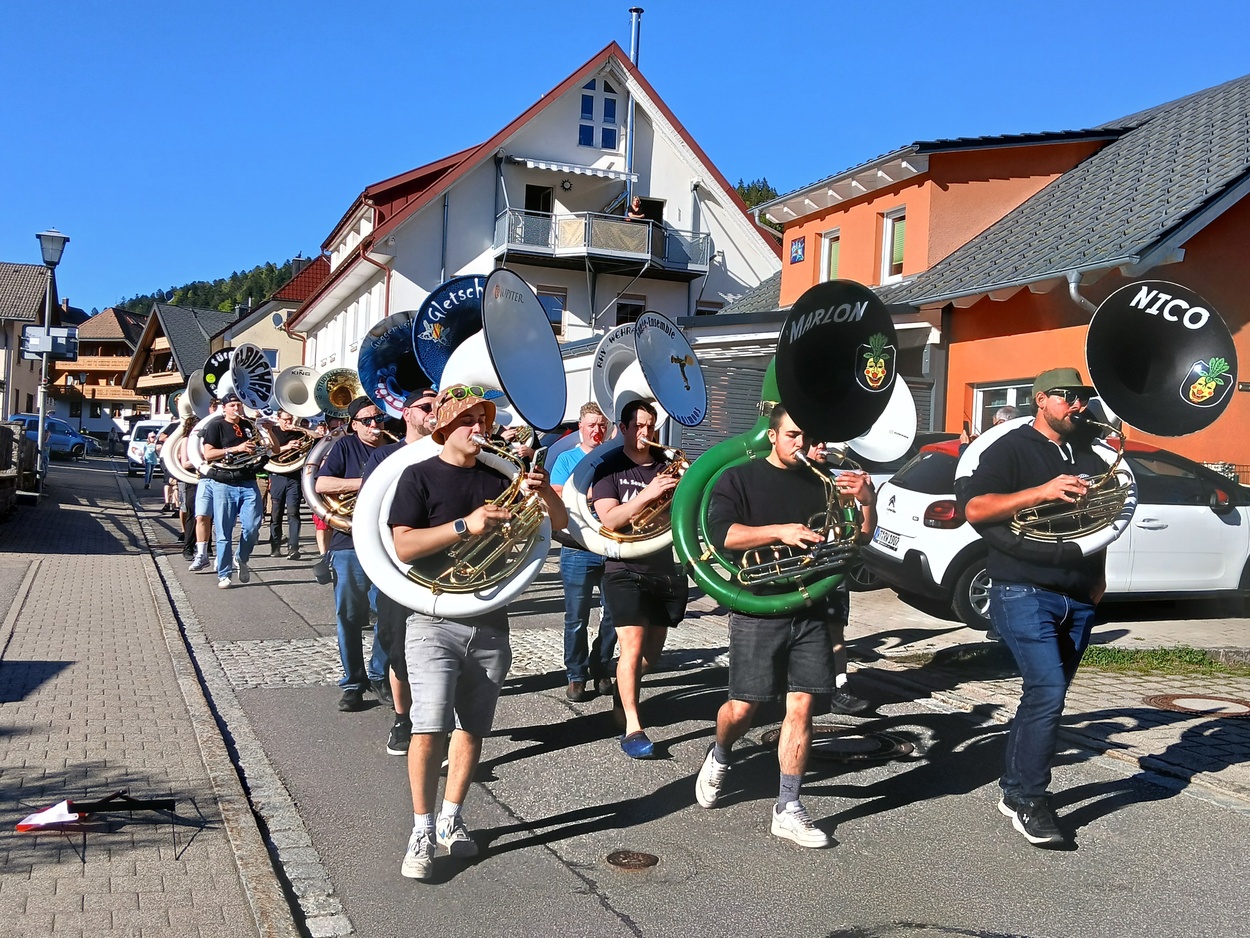 Der erste Todtmooser Sousa Lauf begeisterte die Zuschauer und Teilnehmer gleichermaßen. Bei strahlendem Sonnenschein zogen rund 50 Sousa Spieler mit ihren mächtigen Instrumenten durch das Lebküchlerdorf. Gestartet wurde um 16.00 Uhr an den Wasserfällen in Hintertodtmoos. Durch den Ortsteil Höfle ging weiter bis in die Hauptstraße und den Häusleweg hinaus auf den Sportplatz. Unterwegs konnten sich die Teilnehmer (unter anderem aus dem Markgräfler Land, aus der Ortenau, aus Küssaberg, aus Wehr, Buch und Brenden sowie vom Hotzenwald) an verschiedenen Getränkestationen stärken. Der Sousa Lauf wurde von Organisator Samuel Mutter kräftig beworben. So war es nicht verwunderlich, dass Sousa Spieler aus der ganzen Region den Weg nach Todtmoos fanden.