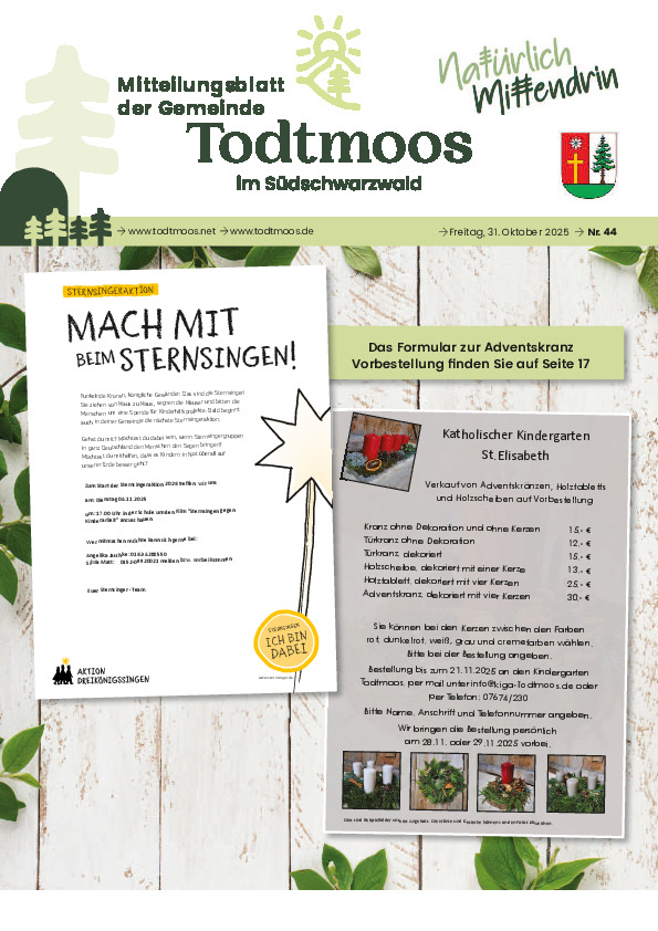Hier finden Sie alle Mitteilungsblätter ab dem Jahr 2020. Der Service, das Mitteilungsblatt der Gemeinde Todtmoos wöchentlich an dieser Stelle als PDF-Datei zu veröffentlichen, geschieht auf freiwilliger Basis, die Gemeinde ist hierzu nicht verpflichtet. Die PDF- Datei wird uns von der Druckerei, dem Primo-Verlag in Stockach zur Verfügung gestellt mit der Auflage, diese Datei erst nach dem offiziellen Erscheinen des Mitteilungsblattes zu veröffentlichen.