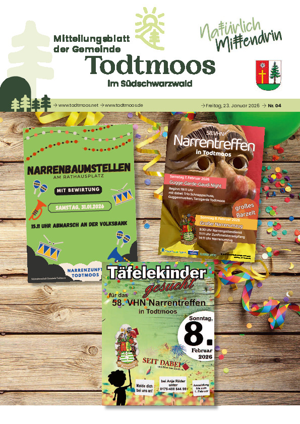 Herausgeber ist die Gemeinde Todtmoos. Für den amtlichen Teil des Mitteilungsblattes ist der Bürgermeister, oder der aktuelle Vertreter im Amt verantwortlich.